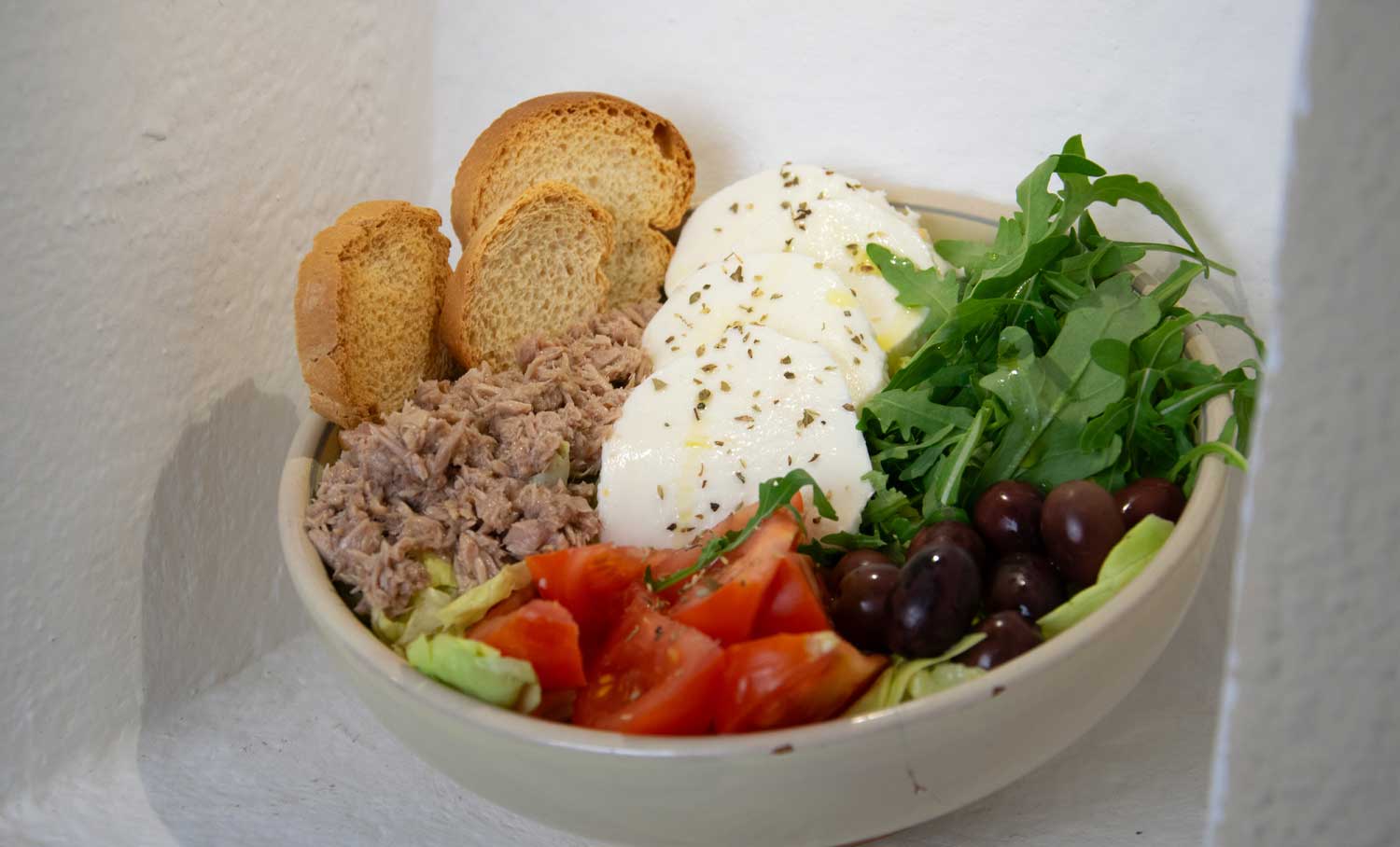 • Insalatona mista con mozzarella, tonno, cetriolo, rucola e pomodoro